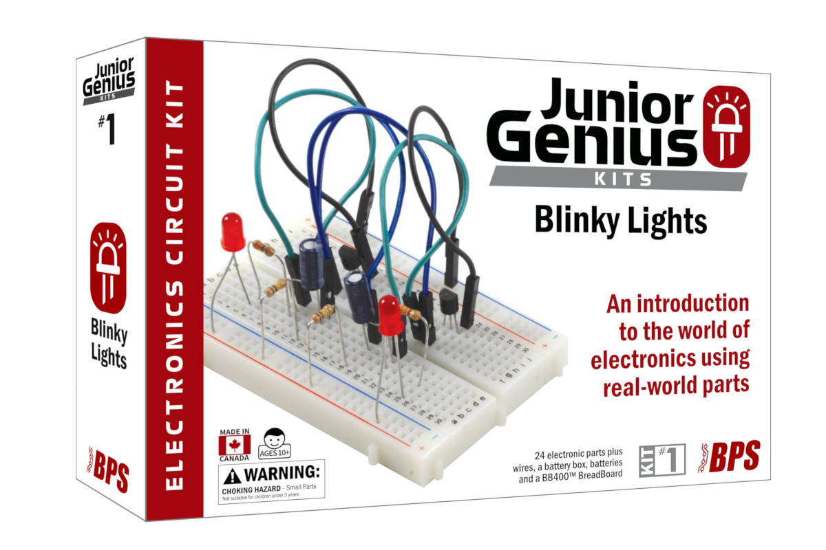 Junior Genius Kits are built for experimentation, learning and fun! Experience the joy of seeing your first LED light up. The Blinky Lights Kit leads you through 10 core activities, from a simple LED circuit up to more advanced transistor LED blinky light circuits, using standard parts on a real-world breadboard.