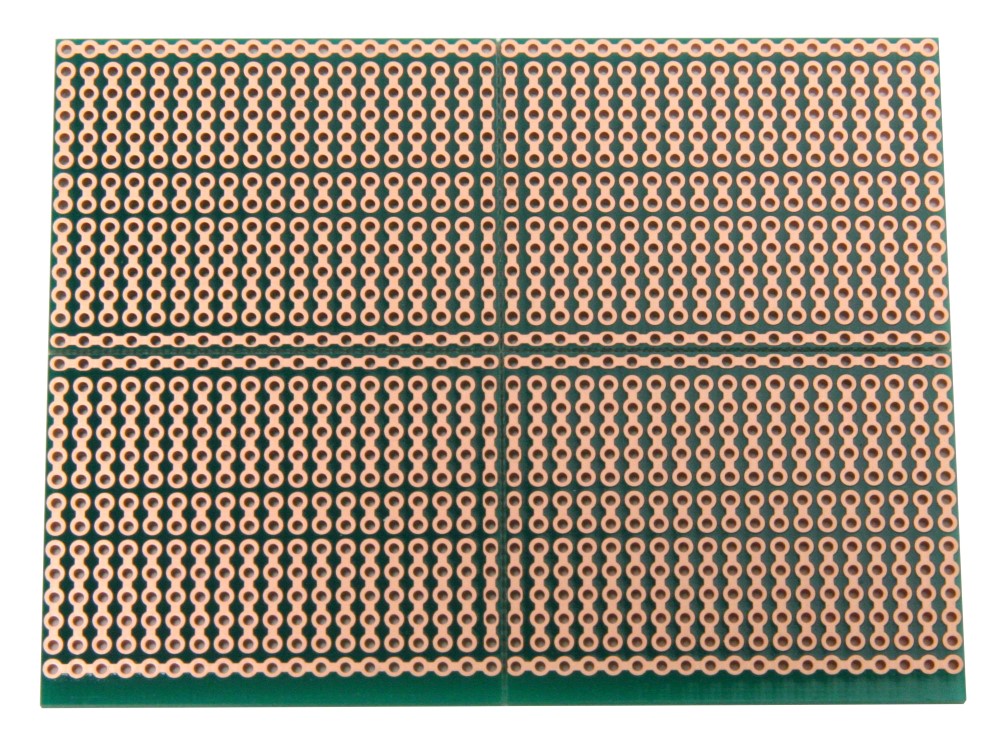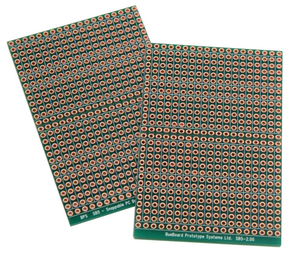 All four of the smaller boards have 5-hole strips, which are good for IC circuits.Each of the four smaller boards has two power rails. There are bonus two-hole pads along the centerline allowing DIL (dual in-line) headers to be used (some boards leave that area empty). A top-side silkscreen helps to position components.