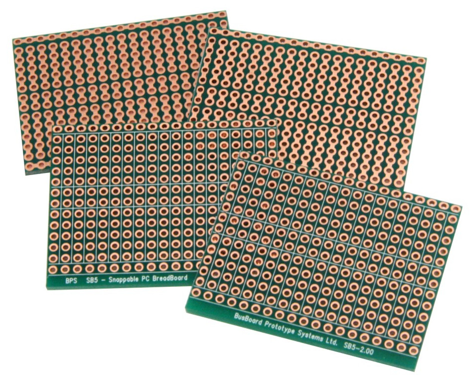 BPS prototyping boards use high-quality FR4 glass epoxy PCBs for long life. An anti-tarnish coating protects the copper for a long shelf-life and provides easy soldering. BPS boards are lead-free and RoHS compatible.