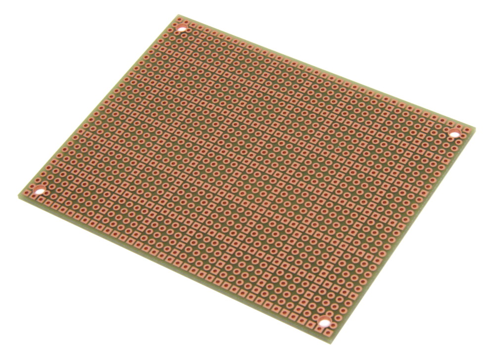 • Pad-per-hole prototyping board with plated-thru holes. A square pad every 5th hole makes it easy to align components on top and bottom.