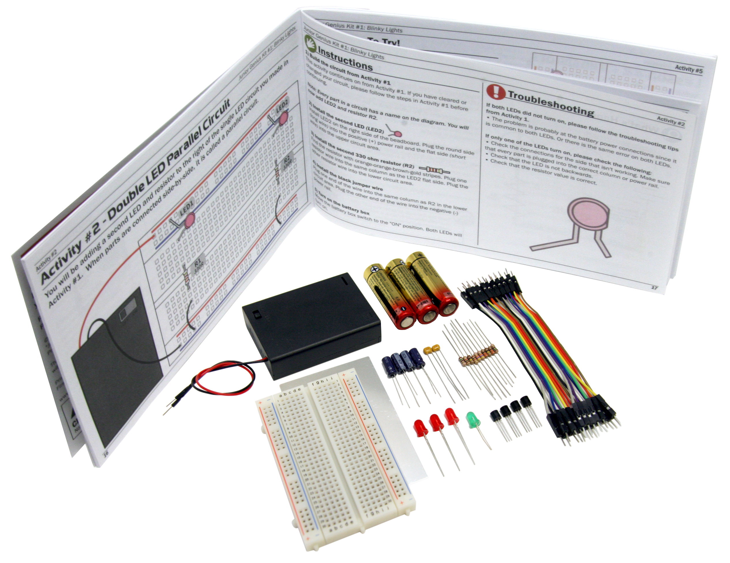 Junior Genius Kits are built for experimentation, learning and fun! Experience the joy of seeing your first LED light up. The Blinky Lights Kit leads you through 10 core activities, from a simple LED circuit up to more advanced transistor LED blinky light circuits, using standard parts on a real-world breadboard.