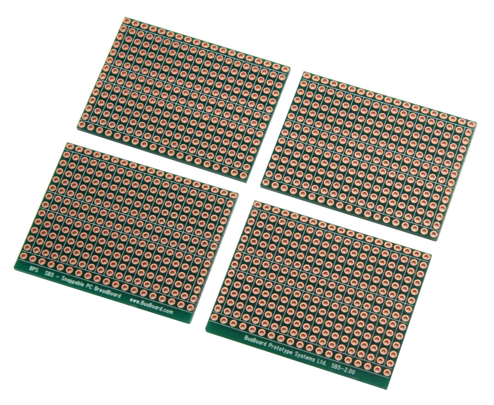 Note: The SB4 Snappable Breadboard is a little smaller with 4-hole strips, and two of the boards have 2-hole strips for higher density circuits (join them if needed for longer strips).
