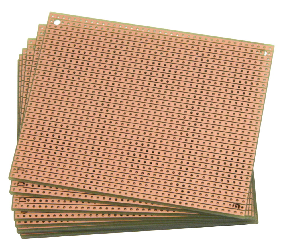 ST2 StripBoard is a prototyping circuit board with a standard long strip pattern. Tracks run the length of the board. The long tracks are convenient for power and ground rails, and for signal buses. Strips can be cut as needed to make smaller tracks and circuit pads. It has 0.1" hole spacing for DIP integrated circuits and headers and other parts. ST2 has higher quality than traditional stripboard. The holes are drilled, not punched. The base material is high-quality FR4 glass epoxy board. It has better stability and moisture resistance than boards using phenolic or SRBP (synthetic resin bonded paper), which can warp with exposure to humidity.